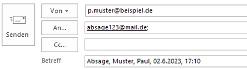 Betreff: Absage, Ihren Nachnamen, Ihren Vornamen, Termin-Datum, Termin-Uhrzeit